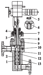 5.電液執(zhí)行機構(gòu)6.防轉(zhuǎn)螺釘7.填料8.閥桿
