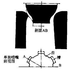 改進(jìn)方法是在接觸環(huán)處噴嘴開始的地方加工出多條擴(kuò)散狀凹槽,分別布置在噴嘴中,由相同尺寸的常規(guī)噴嘴分隔開,如圖3所示。這樣兩股汽流在交界面處發(fā)生強(qiáng)烈混合。由于粘性耗散的影響,如果激波發(fā)生,強(qiáng)度屬于中等。這種混合極其復(fù)雜,難以計(jì)算,但誘發(fā)的擾動消除了。