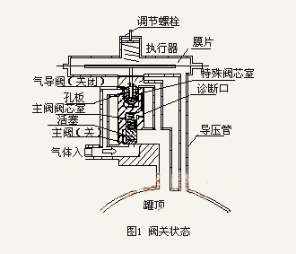 如圖1所示,當?shù)忾y關(guān)閉時,主閥的活塞是在一個密封室內(nèi),當儲罐壓力等于或大于設(shè)定的壓力時,膜片就被向上頂起,氣導(dǎo)閥在彈簧的作用下向上移動,把氣導(dǎo)閥上的密封圈緊緊壓在閥座上,關(guān)閉了控制氣的進口,同時特殊閥芯室的壓力增加并接近氮氣總管的壓力,此壓力通過內(nèi)部通道,從特殊閥芯室傳到主閥閥芯室。主閥的活塞就處于氮氣總管壓力的作用,由于主閥閥芯上、下所受氣體壓力平衡,所以主閥閥芯在自重和彈簧的作用下將閥門緊密關(guān)死。