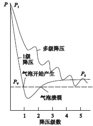 高壓液體流經(jīng)節(jié)流孔時(shí),閥座相當(dāng)于節(jié)流孔板(圖4),靜壓能與動(dòng)壓能相互轉(zhuǎn)換,流速的增加導(dǎo)致壓力降低。當(dāng)壓力降低至等于或低于該液體在入口溫度下的汽化壓力PV時(shí),液體中的氣核即膨脹而形成汽泡。流過(guò)節(jié)流面后,在寬敞的下游流道中流速下降,壓力回升。當(dāng)壓力回升至P2時(shí),并≥PV時(shí),汽泡潰裂,這即是汽化過(guò)程。汽泡潰裂時(shí),釋放出巨大的能量,對(duì)閥座、閥瓣等節(jié)流元件產(chǎn)生破壞即汽蝕。汽蝕的破壞力很大,一般的閥門(mén)在汽化條件下,運(yùn)行一定時(shí)間后即遭受嚴(yán)重汽蝕,致使閥座泄漏量高達(dá)額定流量的30%以上,調(diào)節(jié)閥完全喪失調(diào)節(jié)控制功能。