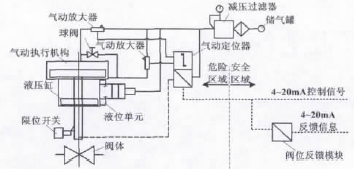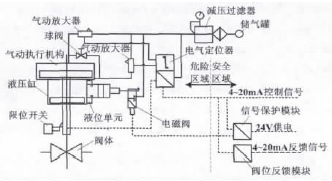 圖2 電氣定位器控制原理圖 3 現(xiàn)有調節(jié)閥安全模式 3.1 方案分析 氣動調節(jié)閥實現(xiàn)了出站壓力的調節(jié)控制,電氣定位器能夠使其在全行程上進行移動。執(zhí)行機構可以連續(xù)地做增壓或者減壓的調整,以達到較好的控制效果。但調節(jié)閥執(zhí)行機構存在故障狀態(tài)下安全模式選擇的問題。安全模式的選擇首先要保證生產(chǎn)的安全性,其次是生產(chǎn)的連續(xù)性。由于長輸管道的特殊性,要求當調節(jié)閥出現(xiàn)故障時,調節(jié)閥處于保位狀態(tài)。 3.2 保位措施 調節(jié)閥的故障狀態(tài)有斷氣、斷電和斷信號三類。 在斷氣故障狀態(tài),連接到液壓單元的氣壓信號中斷,液壓單元的內部液壓油路被關閉。由于液體是不可以壓縮的,液壓缸內的閥桿無法移動,因此執(zhí)行機構被鎖定,實現(xiàn)保位功能。由于供氣管線安裝有壓力變送器,當調節(jié)閥出現(xiàn)斷氣故障時,站控制系統(tǒng)發(fā)出氣源壓力低報警信號,提醒工作人員及時處理并檢查調節(jié)閥狀態(tài)信息。 在斷電故障狀態(tài),由于控制系統(tǒng)電源采用在線式不間斷電源(UPS)供電,且后備電池時間為2h,因此調節(jié)閥不考慮斷電時的保位措施。 在斷信號故障狀態(tài),DVC6010無法切斷液壓單元的氣壓信號,因此無法實現(xiàn)保位功能。 4 改造后調節(jié)閥安全模式 針對斷信號故障狀態(tài)下無法實現(xiàn)保位功能的問題,對調節(jié)閥執(zhí)行機構進行改造。在電氣定位器和執(zhí)行機構之間加裝電磁閥,控制室增加信號保護模塊,實現(xiàn)調節(jié)閥斷信號保位功能。改造后調節(jié)閥控制原理圖如圖3所示。