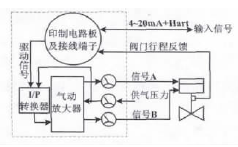 圖1 調節(jié)閥控制原理圖 2.2 電氣定位器控制原理 FISHERDVC6010電氣定位器是基于微處理器將電信號轉換成氣動信號的儀表。微處理器將給定值與閥門形成的反饋值進行比較,當出現(xiàn)偏差時,微處理器依據(jù)偏差的大小和方向輸出一個驅動信號。該驅動信號通過電氣(I/P)轉換器,將電信號轉換成氣動信號,再通過氣動放大器放大,按照位置方向輸出給氣動執(zhí)行機構。執(zhí)行機構依據(jù)接收的信號A或者信號B進行上下移動,從而使閥門開度在全行程上進行移動。電氣定位器控制原理圖如圖2所示。