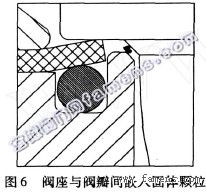 對(duì)于夾帶固體顆粒的流體介質(zhì),軟閥座閥門的密封結(jié)構(gòu)更為重要。這主要是因?yàn)榻橘|(zhì)中夾帶有固體顆粒時(shí),極容易卡在閥瓣和閥座的密封面之間,妨礙了閥座的密封,會(huì)引起泄漏,繼而由于介質(zhì)的高速?zèng)_刷而使閥座表面被沖蝕破壞。對(duì)于上述具有二級(jí)關(guān)閉作用的軟閥座密封結(jié)構(gòu)(圖6),即使出現(xiàn)了這種顆??ㄔ陂y瓣和閥座金屬密封部位之間,也不會(huì)有什么危害,因?yàn)檫€有閥瓣和軟閥座之間的密封,仍能起到可靠有效的補(bǔ)充密封作用。