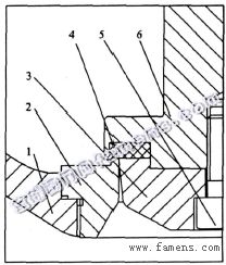 隨著工業(yè)技術(shù)的發(fā)展,用戶希望獲得更高質(zhì)量的閥門,同時(shí)也要求提高閥門的使用、維修水平。這就對(duì)工程技術(shù)人員提出了新的要求,除了要精心設(shè)計(jì)出高質(zhì)量和高水平的閥門,合理選用和正確操作之外,還要方便維修人員的維修和拆卸,方便快捷,使各類事故及維修時(shí)間降到最低限度。于是,對(duì)于單座調(diào)節(jié)閥來說,就出現(xiàn)了圖2所示的改進(jìn)型軟密封結(jié)構(gòu)設(shè)計(jì)。在這種結(jié)構(gòu)設(shè)計(jì)中,用金屬擋環(huán)和軟密封環(huán)代替了傳統(tǒng)結(jié)構(gòu)中用螺釘固定嵌入式軟密封環(huán)的設(shè)計(jì),用壓套和閥座密封墊直壓式結(jié)構(gòu)設(shè)計(jì)代替了傳統(tǒng)結(jié)構(gòu)中閥座采用螺紋連接的設(shè)計(jì)。這樣的設(shè)計(jì)優(yōu)點(diǎn)是當(dāng)閥瓣和閥座達(dá)到最后關(guān)閉位置時(shí),閥瓣給閥座的部分力由金屬擋環(huán)承擔(dān),并直接傳到閥座,這樣就排除了軟密封環(huán)因過載而損壞,而且金屬擋環(huán)還提供了一定的輔助密封作用。直壓式結(jié)構(gòu)設(shè)計(jì)也改變了需要專用工裝才能拆卸的螺紋連接閥座設(shè)計(jì),裝配與拆卸、現(xiàn)場維修與更換都十分方便。
