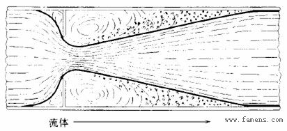 圖1就是一個在節(jié)流孔后產生空化作用的示意圖。許多氣泡集中在節(jié)流孔閥后,自然影響了流量的增加,產生了阻塞情況,因此,閃蒸和空化作用產生的前后的計算公式必然不同。在產生空化作用時,在縮流處的后面,由于壓力恢復,升高的壓力壓縮氣泡,達到臨界尺寸的氣泡開始變?yōu)闄E圓形,接著,在上游表面開始變平,然后突然爆裂,所有的能量集中在破裂點上,產生極大的沖擊力