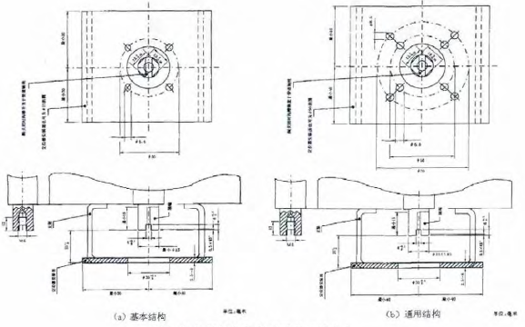 IEC60534-6-2《工業(yè)過程控制閥第6-2部分定位器與控制閥執(zhí)行機構(gòu)連接的安裝細節(jié)定位器在角行程執(zhí)行機構(gòu)上的安裝》,適用于角行程執(zhí)行機構(gòu),其基本結(jié)構(gòu)和通用結(jié)構(gòu)的規(guī)范尺寸見圖2、圖3、圖4。