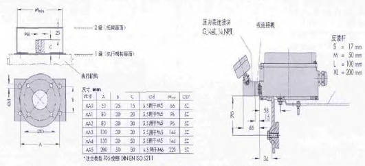 SAMSON執(zhí)行機構(gòu)品種規(guī)格齊全,其中既有同時提供符合IEC60534-6-1的鑄造支架側(cè)面凸緣接口和符合VDI/VDE3847直接集成接口的3277型氣動執(zhí)行器(具有符合VDI/VDE3847的直接集成連接的執(zhí)行機構(gòu)由于規(guī)范的支架尺寸和內(nèi)置氣路等原因,膜室尺寸受到結(jié)構(gòu)限制,3277型膜片有效面積最大到700cm,2共有6種尺寸);也有從120到2*2800cm有效面積、結(jié)構(gòu)為符合IEC60534-6-1鑄造支架側(cè)面凸緣的3271型氣動執(zhí)行器(有7種尺寸),對角行程執(zhí)行機構(gòu)符合VDI/VDE3845,連接細節(jié)參見圖5。