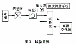 冷卻水由水源流出,經(jīng)調(diào)節(jié)閥調(diào)至合適流量后,進入到試驗段的閥座矩形槽中,當(dāng)高溫空氣流經(jīng)試驗段的閥座中腔通道時,則會與冷卻水進行對流換熱。試驗段裝有溫度測量系統(tǒng),可對冷卻水和高溫空氣進的出口溫度及閥座壁面溫度進行測量。